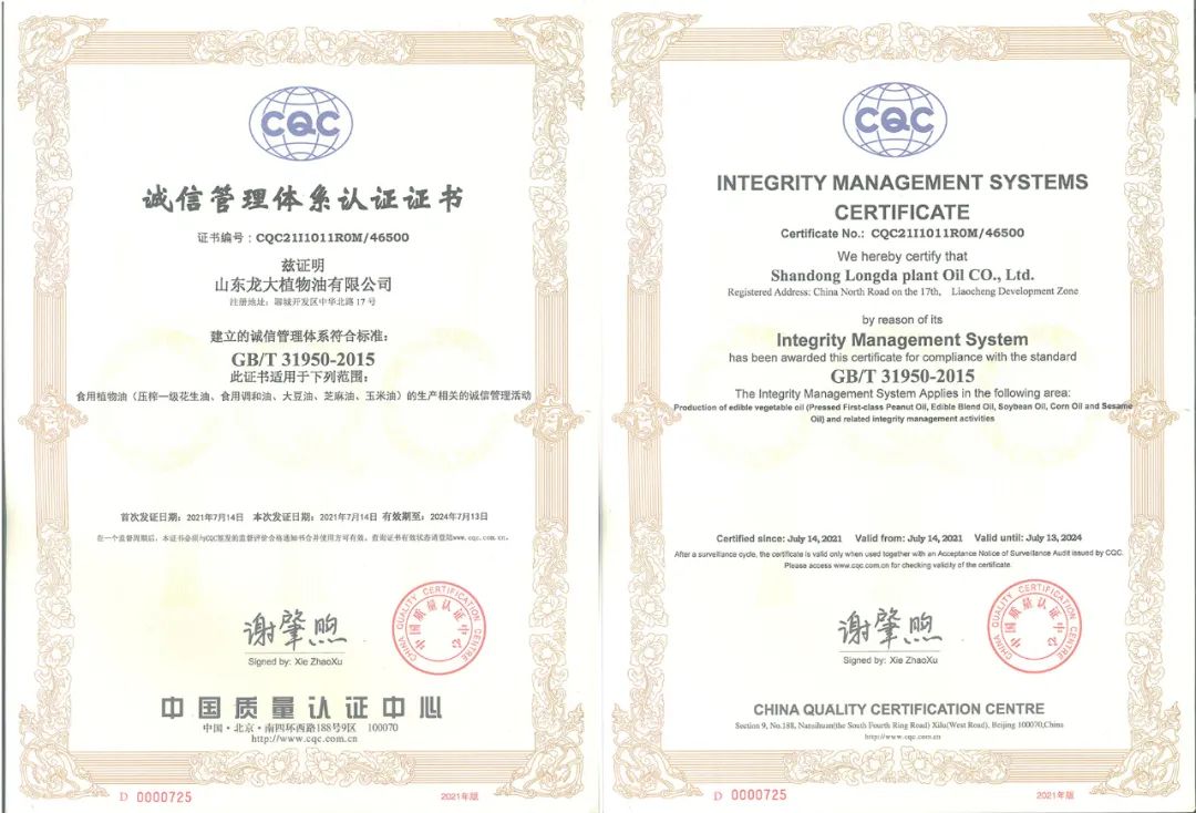 近日,中檢集團(tuán)山東公司向山東龍大植物油有限公司頒發(fā)了首張食品行業(yè)的誠信管理體系認(rèn)證證書,這是山東公司頒發(fā)的首張誠信管理體系認(rèn)證證書。企業(yè)誠信管理體系建設(shè)是社會誠信體系建設(shè)的重要組成部分,可以幫助企業(yè)樹立良好的品牌形象,展示企業(yè)的誠信度。依據(jù)GB/T 31950-2015《企業(yè)誠信管理體系》標(biāo)準(zhǔn)建立的誠信管理體系,可以有效控制企業(yè)的誠信風(fēng)險,其認(rèn)證結(jié)果在政府采購、公共資源交易、招標(biāo)投標(biāo)、市場招商、賒銷采購等活動中是展示企業(yè)投標(biāo)信譽(yù)、核心競爭力、綜合實(shí)力的權(quán)威證明。
